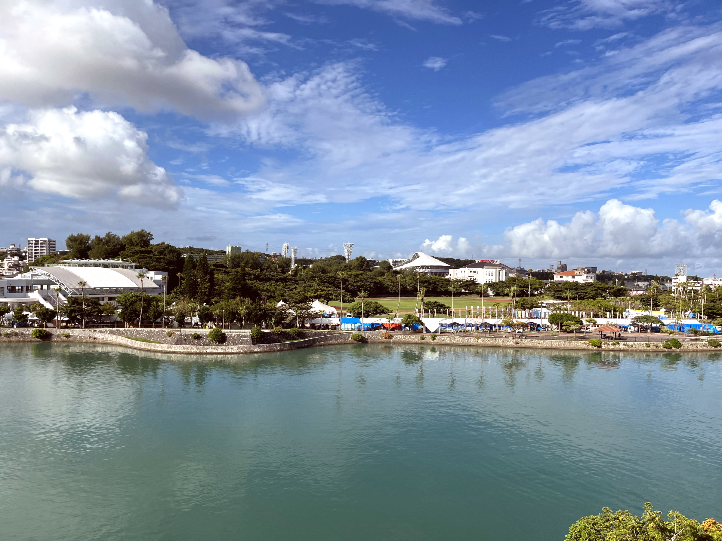 【写真左】25日(土)朝、「沖縄の産業まつり」がひらかれている奥武山公園をゆいレールから撮影。森に隠れてわかりにくいですが、写真右手奥の県立武道館にかけて、テントがぎっしり立ち並んでいて、国際通りに負けずにぎやかです。今年もいろいろ飲んだり食べたりして楽しみました。 【写真中】25日(土)午前は、西原道場で親川仁志先生に稽古をつけていただきました。仁志先生、なにかとお忙しいなか、ご指導いただきありがとうございました <m(_ _)m> 【写真右】26日(日)、夜の懇親会。え?毎回同じ店の同じ席?