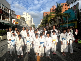 2025年10月26日(日)───「空手の日記念演武祭」に芦屋道場から5人が参加してきました(G・CK・CC・K・H)。今年は少林寺流全体としての参加者数も少なく、演武終了後に撮った右の集合写真がほぼ全員でした(芦屋道場5人・横浜道場1人・浦添道場6人・花城道場9人)。ちょうど学校の運動会が重なった道場が多かったんだそうです。今年われわれ全沖縄空手道連盟の配置は第2エリア。遠くに先頭のステージが見える位置だったので、約3000人による普及型T・U・Vのいっせい演武もいちだんと迫力を感じることができました。しかし人数が少なかったせいで、後半の団体毎の演武では、ショウリン流系道場に1ヵ所の演武スペース、つまりこの4道場に1ヵ所の演武スペースと50分ほどの演武時間を与えられたので、かなり時間をもてあまし気味… f^^; 少人数の演武や個人演武をつなぎ、なんとか時間を使い切りました (^.^)v 来年はもうちょっと準備して参加します!