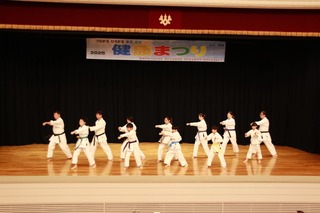 2025年11月2日(日)───2年に一度の健康まつり、今年は嘉納治五郎先生ゆかりの御影公会堂でひらかれ、創作エイサー神子(かみんぐゎ)や沖縄三線同好会の皆さんと一緒にステージをつとめました。まず健康まつりのオープニングイベントで創作エイサー神子がミルクムナリを演舞。まつり主催者あいさつのあと、芦屋道場メンバーがアーナンクーの団体演武とアーナンクーの分解組手を演武。つぎに神子が3曲(命うまりとてぃ・シンカヌチャー・浪漫飛行)を演舞、続いて三線同好会が芭蕉布と安里屋ユンタを演奏しました。阪神淡路大震災30年の今年、防災減災の決意をあらたに、三線同好会が地謡(じうてー)をつとめ神子が「満月の夕(ゆうべ)」を演舞して、3団体のステージをしめくくりました。出演してくれた皆さん、お疲れさまでした。応援にかけつけてお手伝いしてくださった皆さん、ありがとうございました。いっぺーにふぇーでーびる!