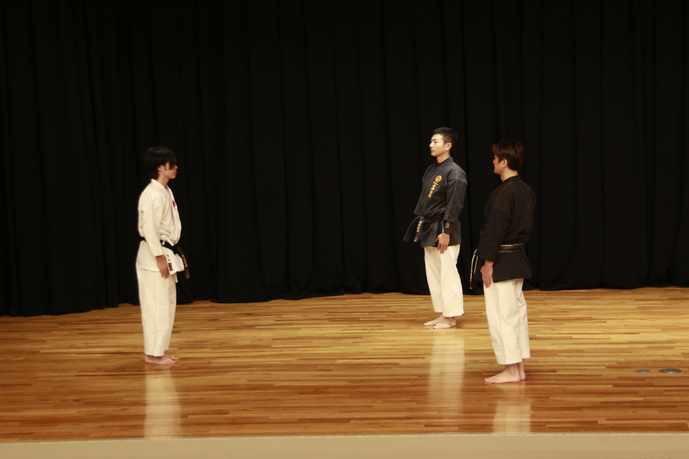 【写真左】オープニングは神谷武史先生が舞う「かぎやで風」。圧巻でした! 【写真中】普及型Tの演武。空手をするには狭いステージなので、並び方や演武方向を工夫して何度も練習してきました。 【写真右】パッサイの団体演武。 ステージから落ちることなく、迫力も見栄えもある演武にするため、今回は3方向の団体演武にしました。