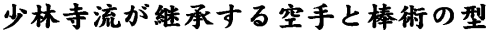 少林寺流空手道は、喜屋武朝徳師が古の達人(【 】内の人)から伝授された空手の型7つと、棒術の型ひとつを継承しています。