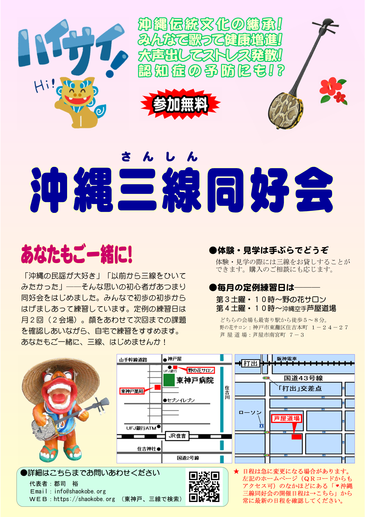 沖縄空手道少林寺流振興会芦屋道場 の「三線班」を中心に、三線初心者があつまったサークルです。月例会は原則2回。会費無料です。